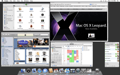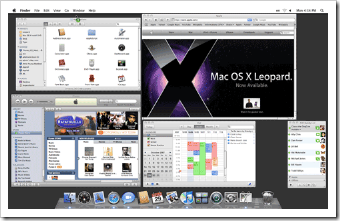 No todo es malo, la función para ver y cambiar aplicaciones de Windows es "Alt + Tab" la cual nos muestra una pequeña ventana con los iconos de los las aplicaciones activas, es útil pero no es gran cosa, la aplicación oficial de Microsoft Alt-Tab Replacement, parte de los Power Toys de Microsoft para los usuarios de Windows XP, hace una mejora añadiendo pequeñas previsualizaciones de cada aplicación, en Windows Vista la cosa es como para sentarse a llorar, se inventaron "Flip 3D" que es como una mezcla de "Alt-Tab" y Powet Toys, pero en 3D...gran cosa. En cambio Apple si pone a disposición del usuario la aplicación Exposé, que organiza perfectamente las aplicaciones en uso y las muestra para poder escoger, es una maravilla, miren: